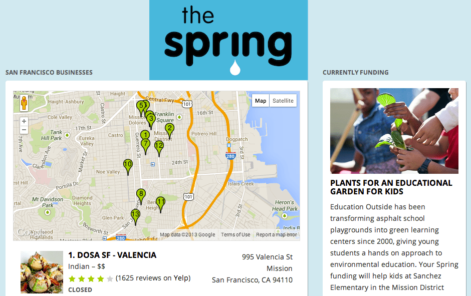 The Spring launches today in San Francisco at a dozen restaurants, including local favorites Dosa and Gracias Madre, and has plans to expand to other cities eventually. Its iOS app and site have a Yelp-like guide for finding participating restaurants, and it even pulls in Yelp reviews to help you discover top eateries.