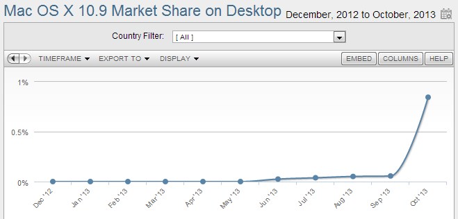 In real, or perhaps gross, terms, Mavericks has market share equivalent to essentially half of Windows 8.1 (an operating system that also launched in October), which reached 1.72 percent in the same month-period. Only Windows 8 users could update to Windows 8.1, giving the latter a market-share pool of roughly 8 percent. Mavericks, by contrast, could only draw from part of OS X’s aggregate 7.73 percent market share, meaning there were fewer total machines that were able to move to Apple’s new operating system. That explains why Windows 8.1 has grown its share more quickly, though the faster sales rate of Windows-based machines has certainly helped, as well.