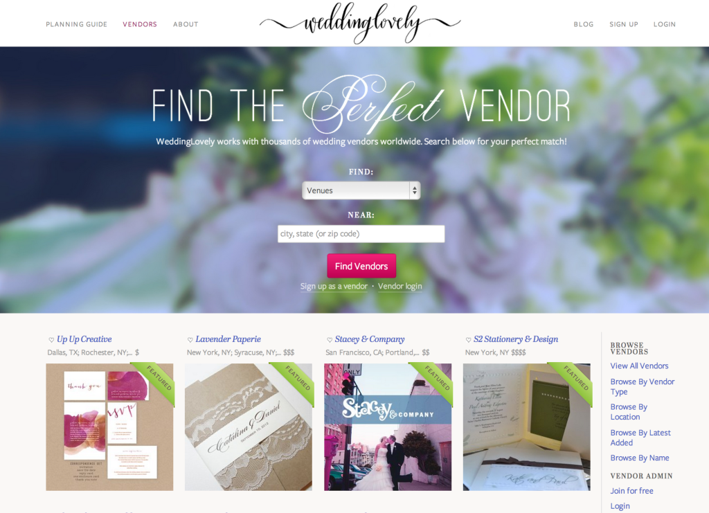WeddingLovely, a small, but growing 500 Startups-backed wedding planning service, has now launched a comprehensive wedding vendor directory that combines more than 2,300 wedding vendor listings under one roof, allowing couples to easily search, filter vendors by budget and location, plus read and write vendor reviews. The new vendor guide is the culmination of several years’ worth of efforts by the company, which had previously operated a series a specialized directories including WeddingInviteLove.com, WeddingVenueLove.com and WeddingPhotoLove.com, for example, ahead of the launch of its consumer-facing planning product last summer.