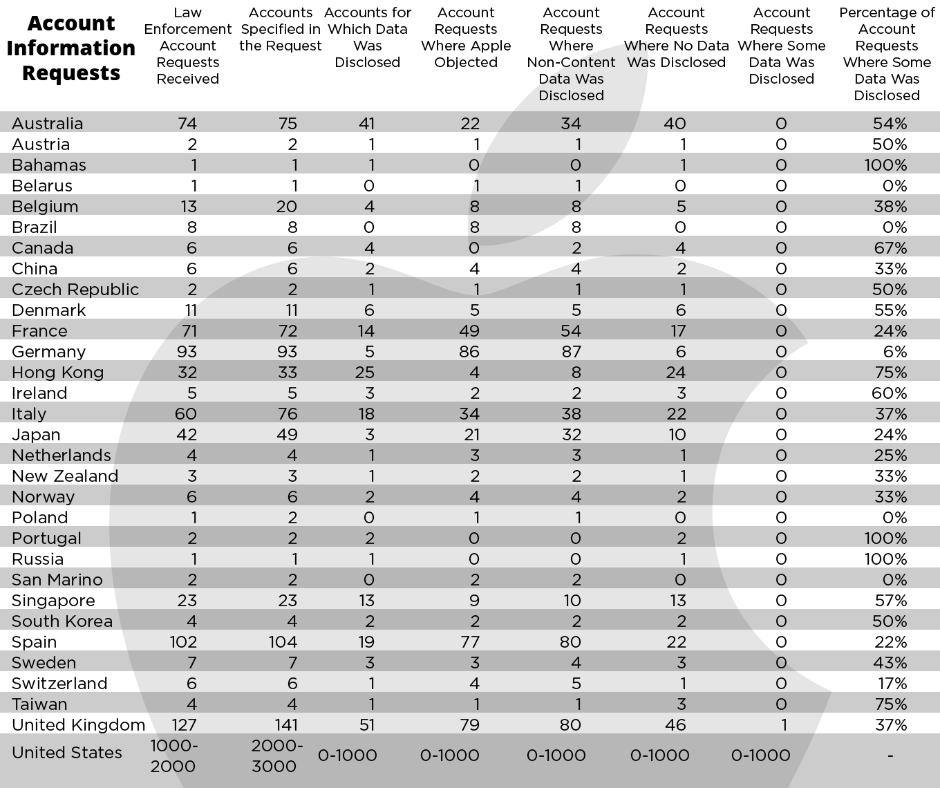 Today, Apple has released its first ever report on government information requests, detailing exact numbers of account information and data requests internationally. The report highlights how restrictive the rules are for Apple in the US, as only ranges of 1,000 are represented there.