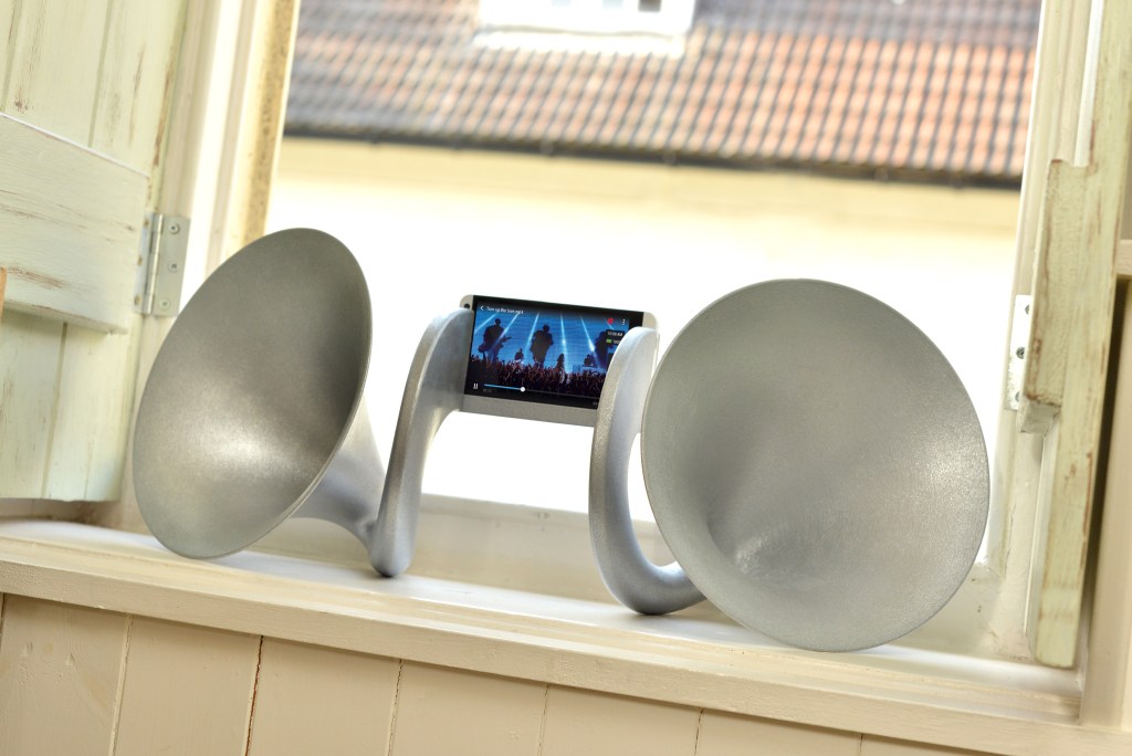 HTC hasn’t come up with this chunk of craziness on its own. It engaged a young UK designer called Justin Wolter to do that for it — maker of the Gramohorn II’s uni-trumpeted predecessor (which was, er, for iPhones). Wolter came up with the dual-trumpet remix of his earlier design, sketched it out and then with a little judicious use of 3D printing, the Gramohorn II was born.