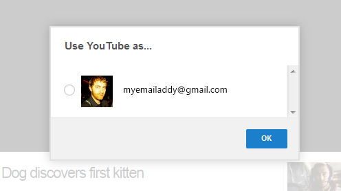 “Use YouTube as…” And the only option is my email address? Not likely, kemosabe! Not even going to click! No x to close this thing, thanks a lot… but I can sure close the tab! Nice knowing you, login box!