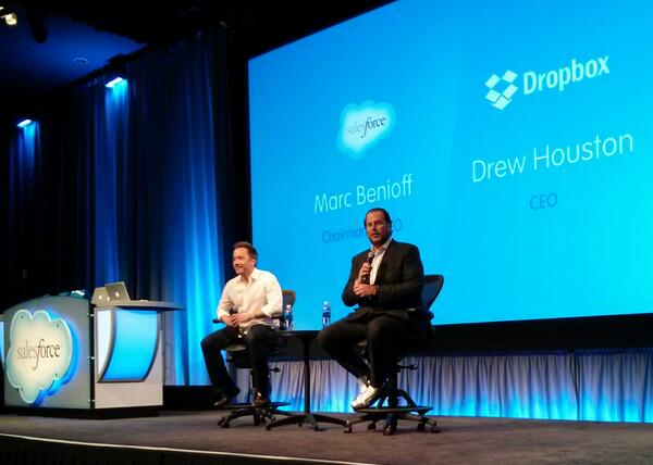 It was a love fest here at Dreamforce today with Salesforce CEO Marc Benioff and Dropbox Founder Drew Houston sharing the stage and asking each other questions in a fireside chat. Well, maybe, it was more about Benioff loving Houston. But beyond the platitudes, Houston did have some things worth sharing about his company that is now believed to be raising $250 million at a whopping $8 billion valuation.