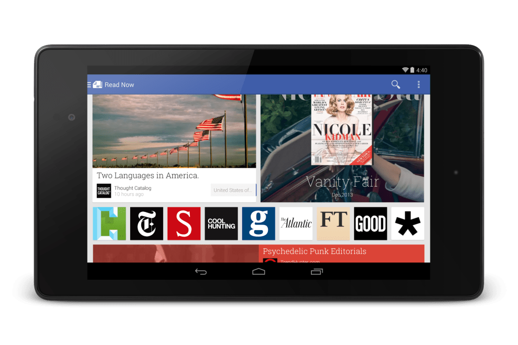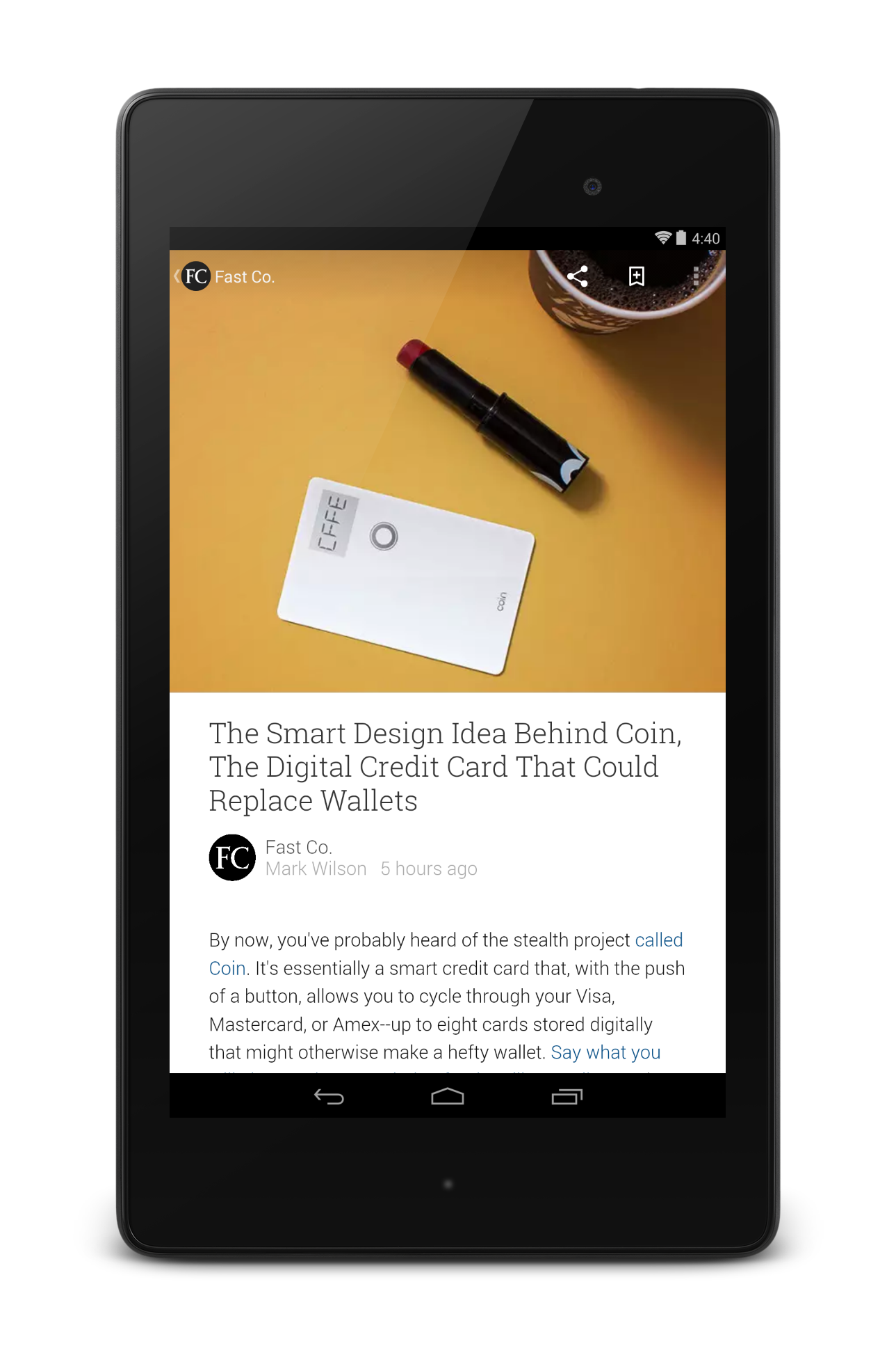 Google says this new app will “put the news you care about most front and center and presents stories that interest you based on your tastes. The more you read the better it will get.” The app will automatically format blog posts and other sources for reading on a tablet or phone. Users will be able to subscribe to new sources in the app and – for paid publications – in the Google Play store. Posts are cached on the device for offline reading.