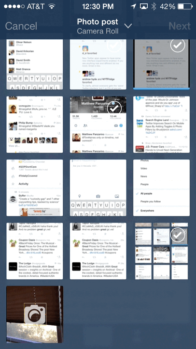 The photo capture screen is really cleverly done, and now dumps you onto a grid of images from your camera roll, rather than allowing you to choose immediately between the roll and the camera. This, Vidani says, was done after the data suggested that people dipped into their albums for images to post far more than they went to the camera. But the camera experience isn’t neglected — there’s a square near the bottom with a camera icon that displays a live view of your phone’s camera, inviting you to shoot an image if you choose. It’s neatly done.