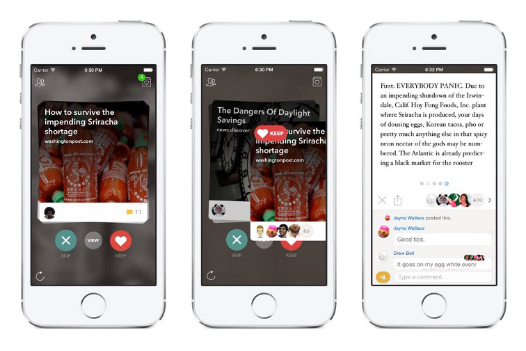 The slides, or cards, are inspired by Tinder, Miller says, who heard from friends that the dating app was cited as their favorite in terms of the navigation. Today, the new version of Potluck lets you swipe through a stack of cards, and tapping on each one will reveal the content (the summary behind the headline), and the conversation where you can comment if you choose. Articles can also be skipped, or kept by clicking an “X” or heart icon, respectively – sort of like a “hot or not” for news.