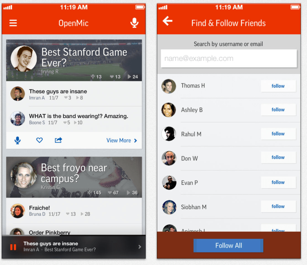 But it’s not really a new idea. From what we’ve seen, it appears OpenMic competes with a number of other voice-based social apps, like Spreaker, Dubbler, Bubbly, Talkbits, and others. To some extent, you could count several mobile messaging apps as competitors, too, including Voxer, Whatsapp or even Facebook Messenger, as recording your voice is also a feature in those applications.