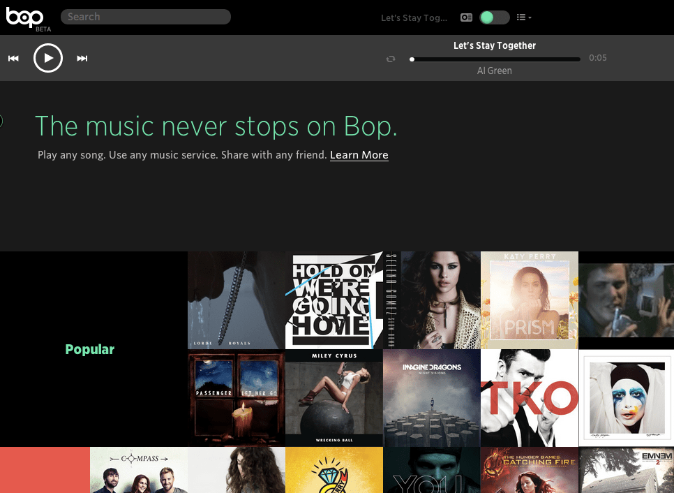 Bop works like this: You can search for and listen to any song on Bop.fm. The service detects what music subscriptions you may have and provides tracks from those services first — currently it catalogues streaming services Spotify and Rdio, as well as free services like YouTube and SoundCloud, and paid-for download services like iTunes, Amazon and Google Play; it plans to add more.