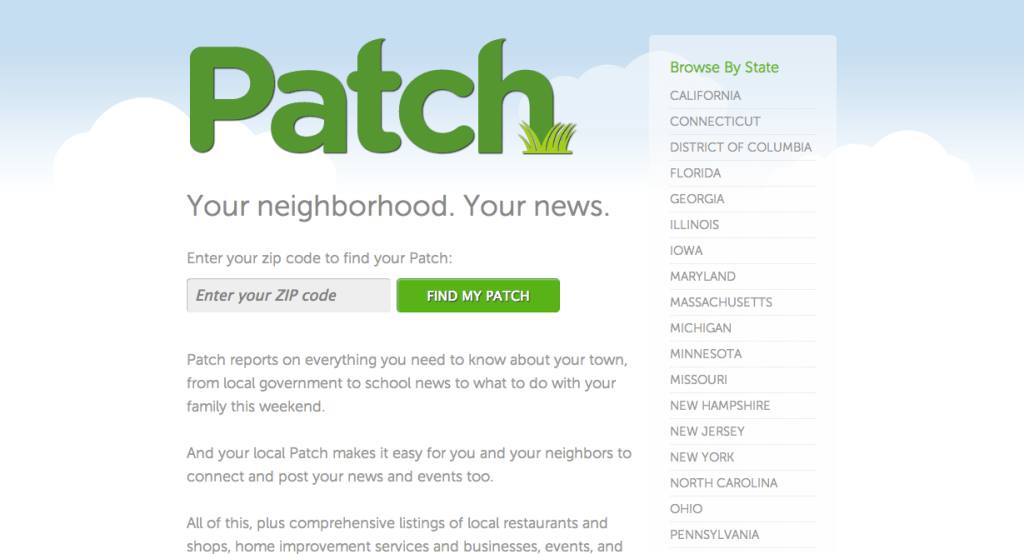 Update: AOL says implications that Patch is closing down are inaccurate. A New York Times article stated that AOL is reportedly planning to “dismantle Patch or perhaps sell it off to various partners,” even though CEO Tim Armstrong “cannot quite admit that it is over.” In response, a spokesman for the company told TechCrunch that it stands behind what CEO Tim Armstrong said at a Dec. 11 UBS conference (PDF link) and in AOL’s last three earnings calls about Patch. (Like Patch, TechCrunch is also owned by AOL).