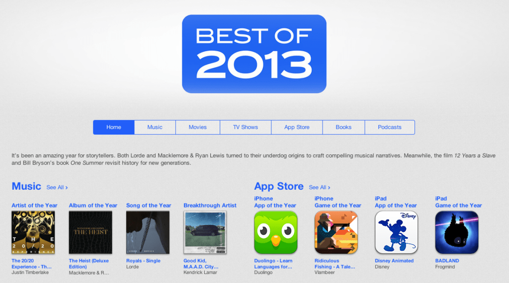 Over in iTunes, pop music and rap ruled, with Justin Timberlake taking Artist of the Year with The 20/20 Experience and The Heist scoring Album of the Year for Macklemore and Ryan Lewis. New Zealand singer-songwriter Lorde’s “Royals” was dubbed Song of the Year, while Good Kid, M.A.A.D. City by Kendrick Lamar took the Breakthrough Album nod.