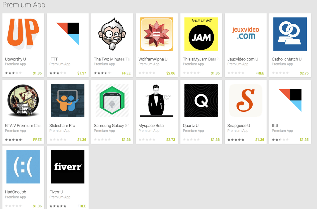 Listed under the developer’s very generic name, “Premium App,” the knock-offs sometimes have a “U” following the app’s title, indicating that they’re really just a user’s guide to the service, not the real app. Many, like IFTTT, (which Premium App has ripped off twice – once as “IFTT” instead of “IFTTT” to capitalize on misspellings), are available as paid downloads ranging from $1.36 USD to $2.75 USD.