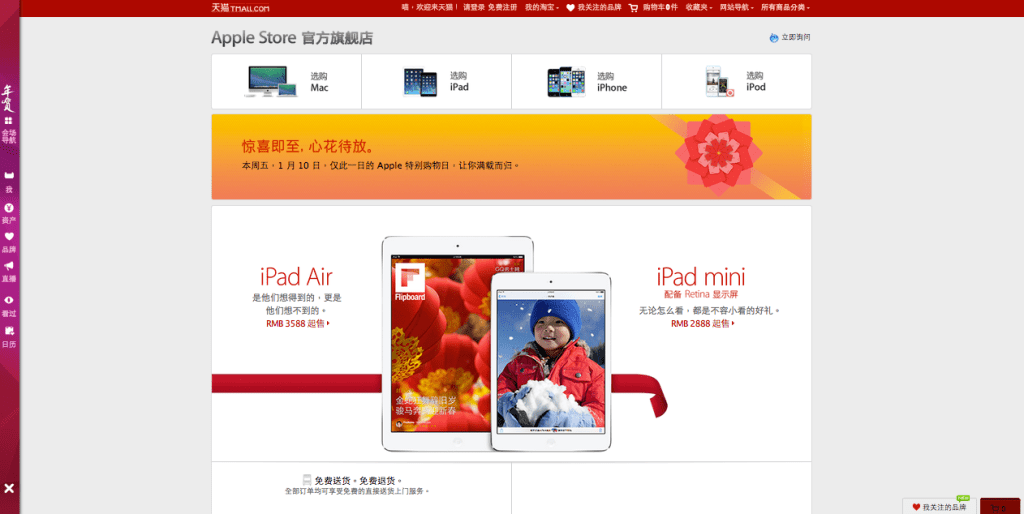 Setting up shop on Tmall gives Apple access to Alibaba’s new social networking tools, which Alibaba developed after inking a strategic partnership with Sina Weibo, the highly influential microblogging platform with 50 million daily active users. Yesterday, the two companies launched Weibo Payment, which integrates with Sina Weibo and helps users to engage in a “social shopping” experience. For example, when someone shares an item, a “buy” button now automatically appears that lets his or her followers view product details and purchase it using Alipay, Alibaba’s payment platform. Weibo Payment also gives Apple a new CRM tool as it localizes it marketing efforts for China. For example, its Tmall store is currently getting ready for “Red Friday” promotions on January 10, an annual promotional event by retailers to herald the upcoming Lunar New Year holiday.