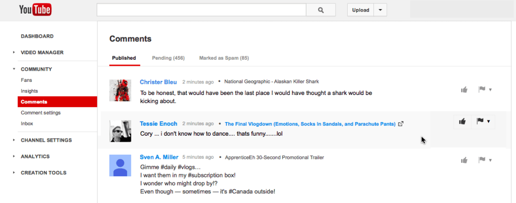 Using this page, video owners can quickly scan their comments, remove offensive ones, flag comments for spam and give comments a thumbs up. The new comments inbox is divided into areas for published comments, pending comments and those marked as spam.