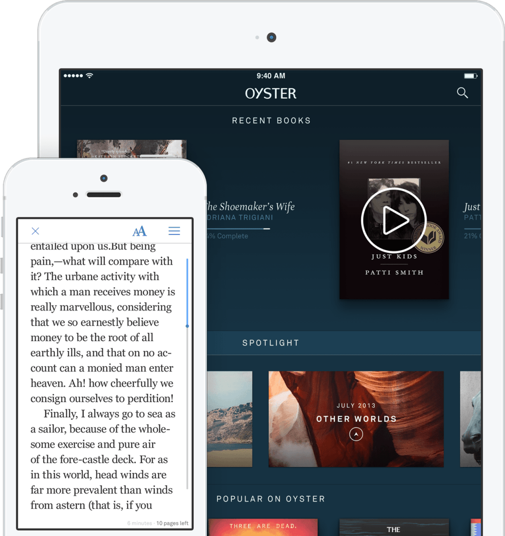 As a reminder, Oyster is an ulimited subscription service for ebooks. For $9.95 a month, you get access to hundreds of thousands of books on your iPhone or iPad — Android support should come soon.