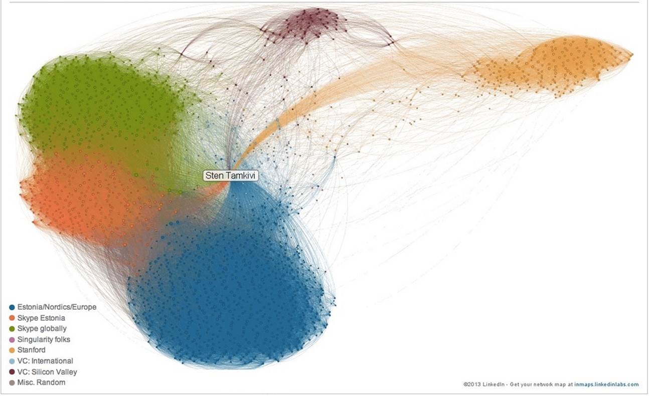 Rather than relying solely on my anecdotal examples of “important places,” I turned to LinkedIn. Mapping my network through the lens of the topic at hand, I can confirm that, while Estonia, the Nordics and Europe in general comprise a tightly knit blue blob, and Skype in Estonia (orange) and internationally (green) is an organism in itself, the Silicon Valley venture capital and serial entrepreneurship circles float as a distant burgundy cloud. And the international graduate student and teacher body of Stanford is even further out on the right.