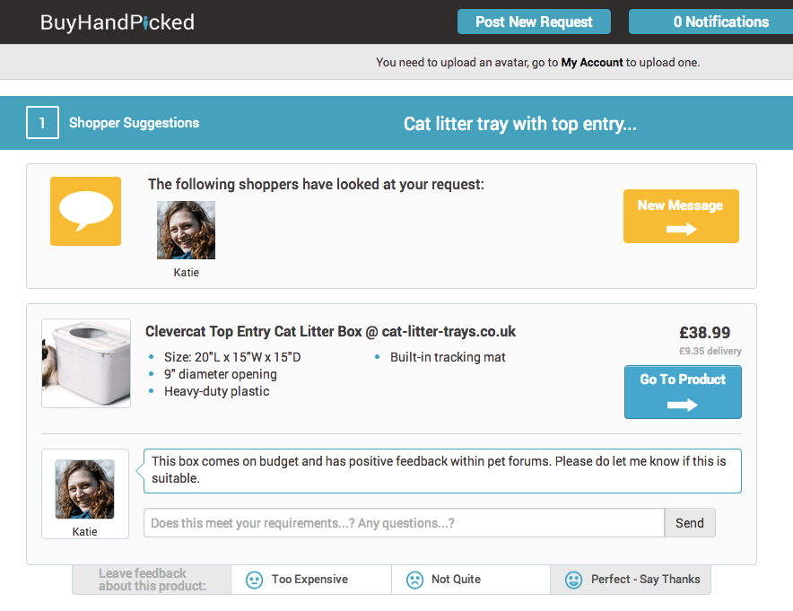 To test the service I asked for something I’ve previously trawled the Internet for: a cat litter tray with an entrance on top of the box, i.e. rather than the more usual side-placement. I made this search even harder by requiring the item not to cost a small fortune to a U.K. buyer — as apparently this ‘Holy Grail’ of cat litters trays does (for some reason).