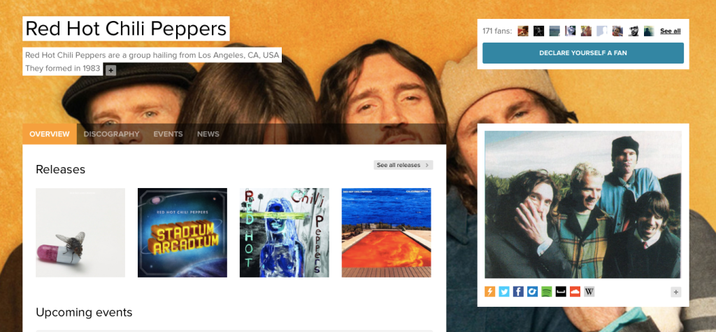 On the fans’ side, Rushmore plans to add new features to enable them to find new music and stay up to date with the music news, gigs and releases that interest them. As it stands, users “follow” the artists they’re fans of, although much of the corresponding content is based on user contributions (pages have a Wiki-esque “edit” button).