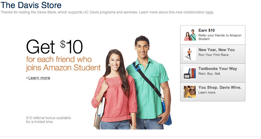 According to the school’s university paper, the Aggie, UC Davis was the first such partnership Amazon announced. The program is now officially a go this week, and UC Davis is giving Amazon the power to blanket the campus with promotion. There’s even an Amazon student ambassador