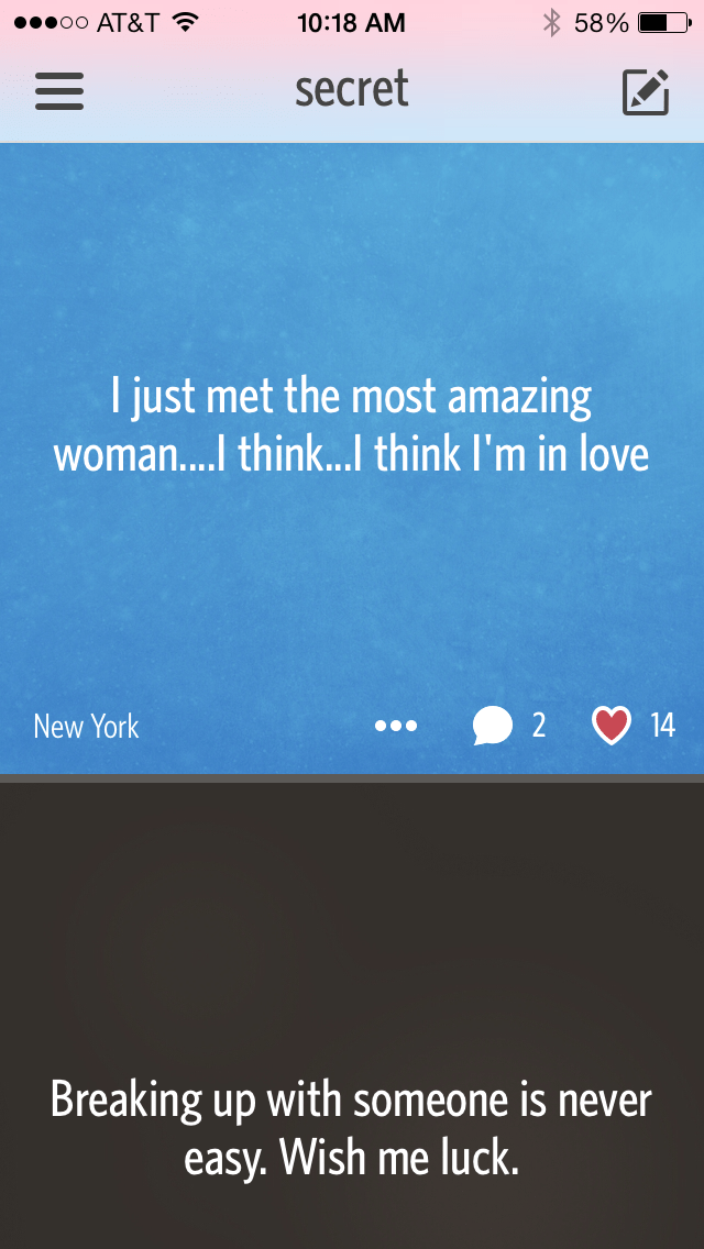 He said that the point was to share things you wouldn’t otherwise attach to your name. The kinds of things people share on Secret are a little bit more vulnerable, insecure, emotional, sad, goofy or angry than what you might see on Facebook or Instagram, where people are trying to groom images of picture-perfect lives.