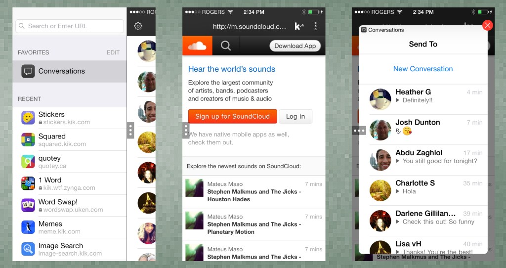 Kik had previously worked on a way to get HTML5-based interactive content into its app to make it easier for its users to find, share and have conversations around content. That effort was called ‘Cards,’ and it debuted back in November 2012, ahead of Kik’s most recent funding announcement last April. Cards represented a huge investment in the idea that the way to stand apart from the rest of the mobile messaging field was to bring apps and web content within the experience, and the new in-app browser is an extension of that vision.