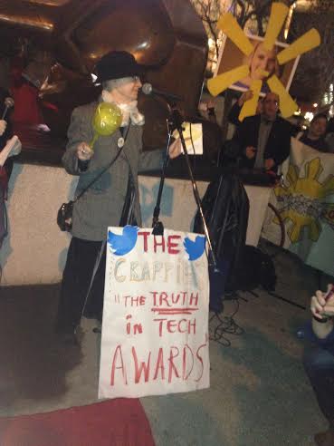 Outside, there were about 50 protesters, beating drums and awarding toilet plungers as trophies to activists posing as Ron “The Con” Conway and Marissa Mayer for “The Crappies,” their own unofficial version of the event.
