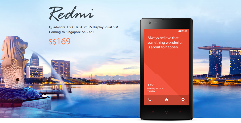 The company unveiled its Singapore site earlier this week. The only product currently featured is the Redmi, Xiaomi’s cheapest Android phone, which will cost just S$169 (or about $133 USD).