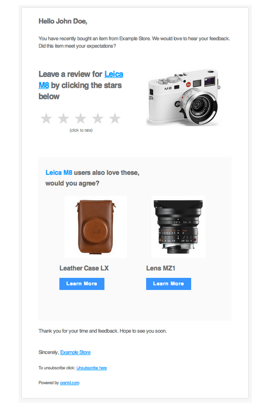 Orankl automatically creates and sends out emails with product recommendations based on data they collect across sites using their review system. It looks at when individual users are most likely to shop, what kind of products they look at, and what they ultimately purchase.
