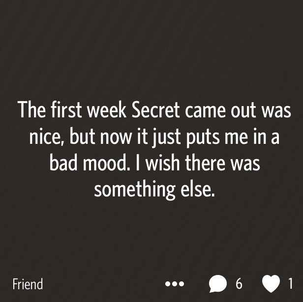Despite sharing this concern, I am a happy user of Secret and other apps in the space, and want to see them adjust themselves to provide maximum objective good with the least amount of bad. Bringing this aspect of human behavior into the light is a first step, as is adding features like post flagging and moderation.