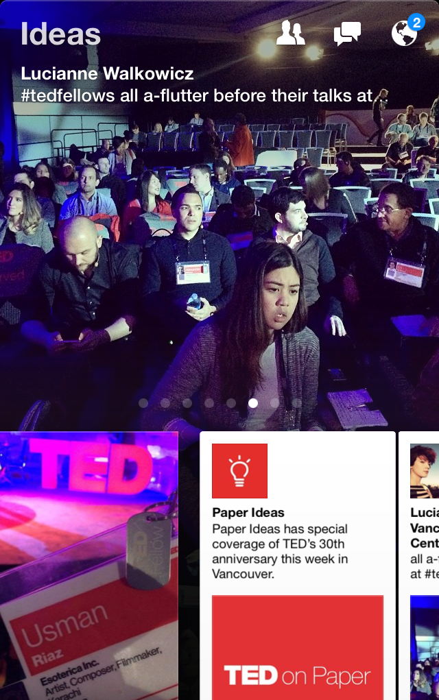 Facebook explains “Over the course of this week, the Ideas section will feature posts, photos and presentations from TED fellows, posts from other TED attendees, TED blog posts, TED talk videos and posts from public figures — like journalists and others — who attend or cover the conference. Much of this content will be exclusive to Facebook and Paper.”