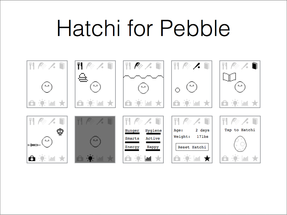 Virtual pets are a natural fit for the wrist-borne Pebble smartwatch, and it was only a matter of time before a Tamagotchi-inspired app made its way to the platform. One of the new games debuting for Pebble at GDC this year is Hatchi, which is exactly that. The app originally appeared on iPhone, and on both platforms it features a pixelated pet for you to play with, though on the watch the pixelation is part of the screen resolution limitations, in addition to being a design attribute.
