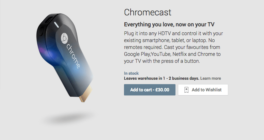 In the U.K. the Chromecast costs £30 from the Google Play store. So it’s not quite as cheap as in the U.S. (as per usual for gadgetry crossing the pond).