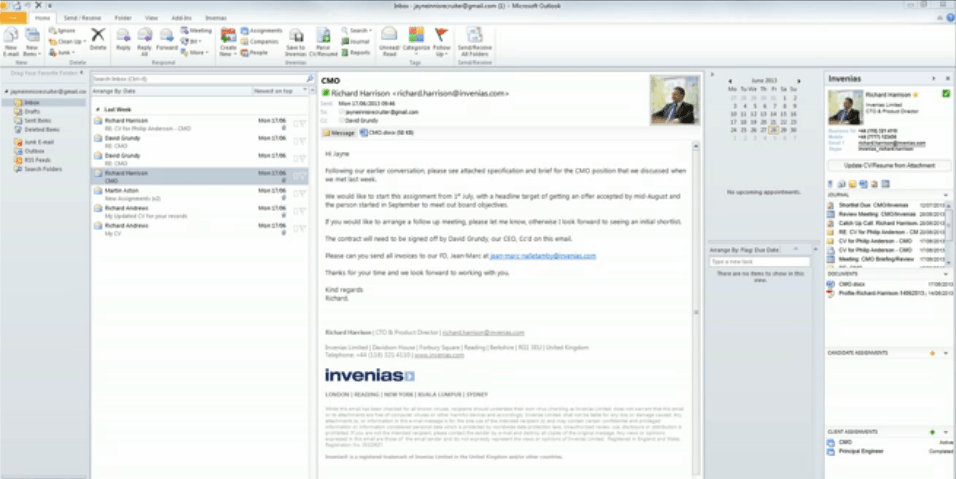 Invenias’ cloud-based software platform integrates with Microsoft Outlook so users can manage and view candidate data within the email program, rather than having to utilise separate software. Candidates’ LinkedIn, Facebook and Twitter accounts are also pulled into the Outlook app for easier viewing.