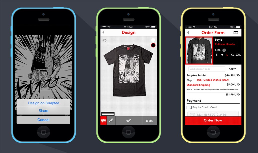 The startup’s first beta partner is Manga Camera, a popular app that turns photos into comic book-like graphics. Snaptee, which is based in Hong Kong, also announced that its users have created over one million T-shirt designs since it launched in August 2013. Wai-Lun Hong, Snaptee’s CEO, says that the app currently has 300,000 registered users, most from the U.S., Japan, Germany, and UK.
