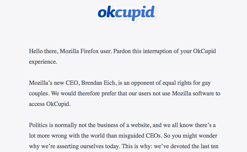 Online dating site OkCupid is presenting Firefox visitors with something other than the standard home page you’d normally encounter – instead, there’s a lengthy message apologizing for the interruption and explaining that OkCupid opposes the political views of Mozilla’s new CEO Brendan Eich, who made donations to a campaign in support of California’s anti-LGBT Proposition 8 campaign.
