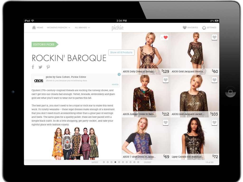 Pickie provides a personalized email newsletter and iPad app to show users products that they would like to buy, based on your interests and mentions by friends on social networks. Designed as part magazine, part catalog, Pickie created a beautiful, shoppable experience for its users.