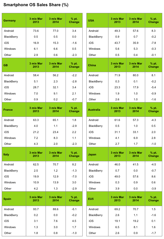 But “bounce back” and “strong performance” are relative terms: the margin between Android and iOS continues to widen, with Android at over 70% of sales in five of the markets surveyed by Kantar.