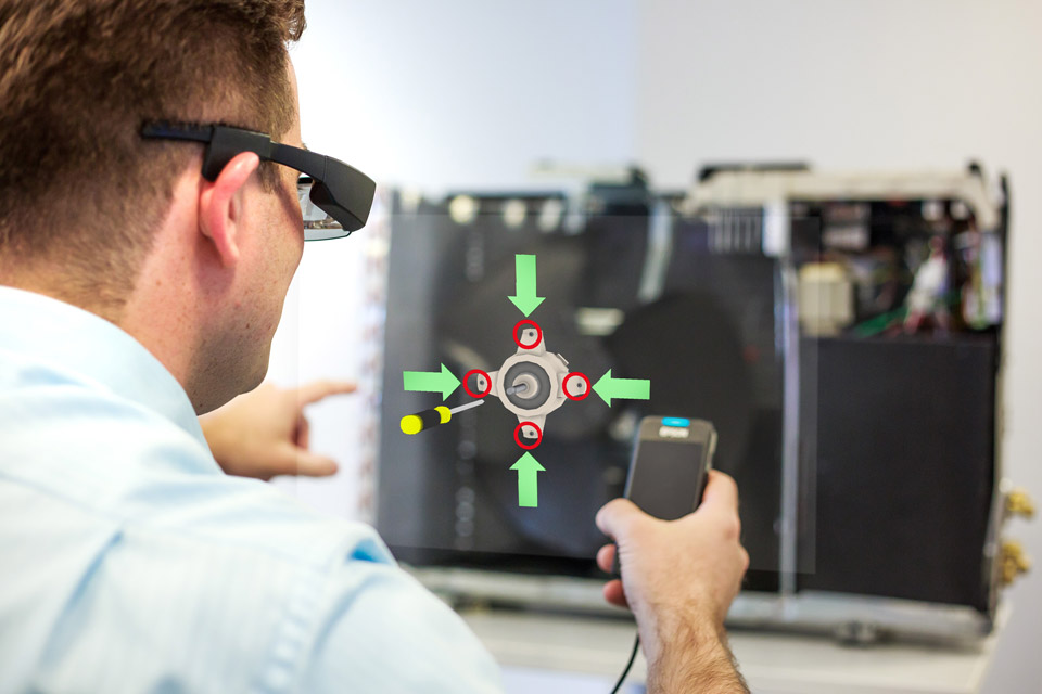 But because of this approach, these glasses have some clear advantages like longer battery life and heat reduction. Metaio, which has been pretty early to AR software market for wearables (and already developed software for Google Glass), capitalized on the hardware advantages of the Epson glasses. The longer battery life allows Metaio’s software to work longer and harder to show more complex content. Typically, the processing power it takes to do AR on Google Glass can empty those smaller batteries in about 15 minutes. The full-field transparent form factor is really what lets the software work optimally though, offering the best UX.