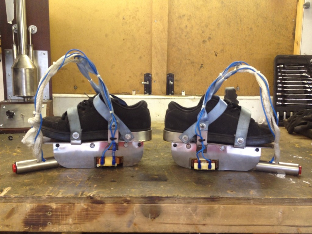 Strapped to each of his feet is an electromagnet (ripped from the coil of a microwave, in order to save a few bucks). Each magnet has a long cable attached to it, a button on which releases the magnet’s hold and allows him to move his feet independently.