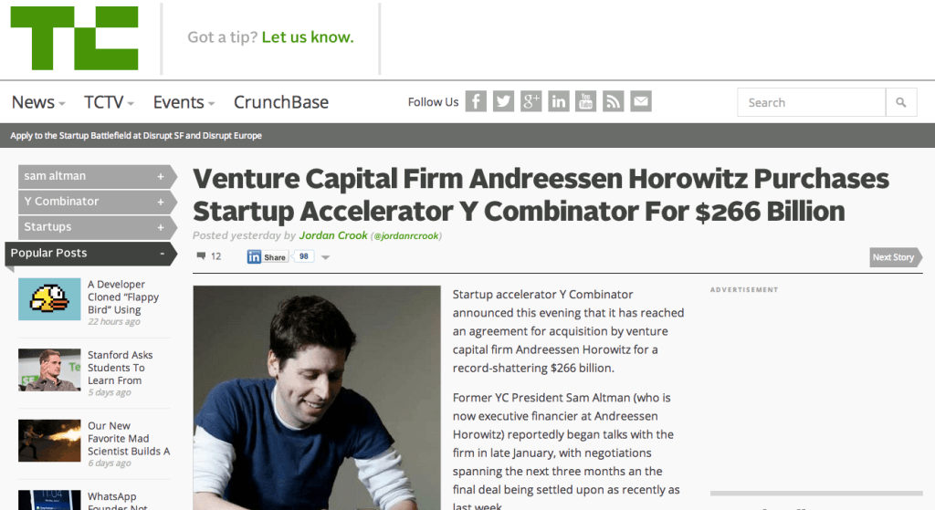 No, Andreessen Horowitz isn’t buying Y Combinator for $266 billion. In fact the post, which looks an awful lot like a real TechCrunch post, is actually a hoax and never appeared on the TechCrunch site at all.