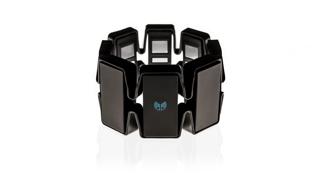The Myo cuff is essentially a series of black rectangular modules with flexible cable housing running top and bottom, with a single size design that can expand or contract depending on forearm size. It still doesn’t look like something you can entirely forget you’re wearing, but we’ll have to wait and see what kind of heft it has and how it feels while it’s worn.
