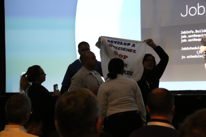 Update: Protestor who temporarily interrupted Google I/O is elementary school teacher Claudia Tirado.