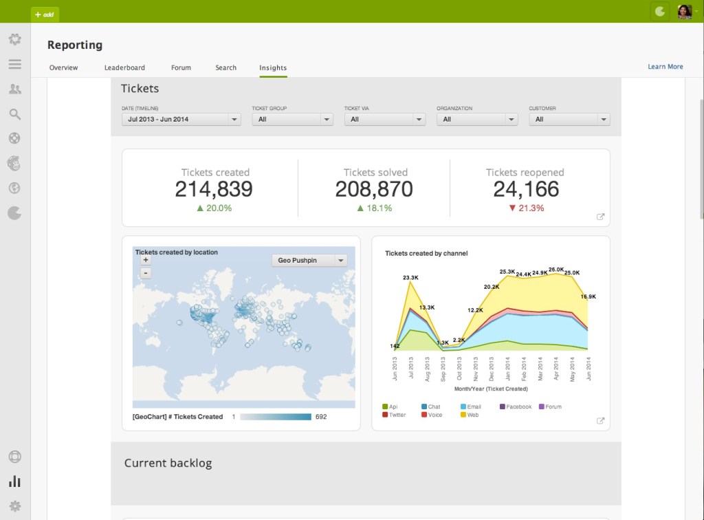 Sam Boonin, who is VP of products at Zendesk, describes his company as a cloud-customer service tool that generates customer support tickets online through interactions with customers on email, social channels, chat and phone. He points out that the product has always provided some reporting capabilities, but the new Insights product provides access to much more detailed information.