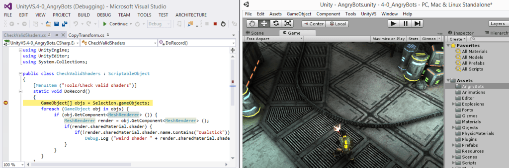 UnityVS helps developers to more easily debug their Unity scripts and provides code snippets, wizards and other tools. It also provides integration between the Unity console and Visual Studio. By default, Unity itself offers its own limited support for Visual Studio C# integration, but UnityVS goes quite a bit beyond this.