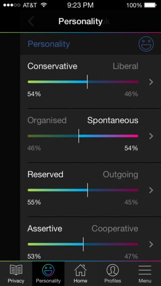 Working with researchers at Cambridge University Psychometric Centre, Citizenme has built an algorithm to draw psychometric conclusions from that data. The app will tell you if you Facebook posts or tweets appear “conservative” or not, on a sliding scale, or perhaps if you are an assertive or a spontaneous sort of person. Stuff like that.
