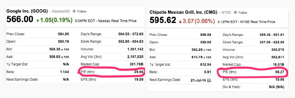 The average P/E ratio on the major stock markets indices is 15. Google’s P/E ratio is 30. Chipotle’s P/E ratio is 56. Said another way: Chipotle’s profits are worth more than Google’s.