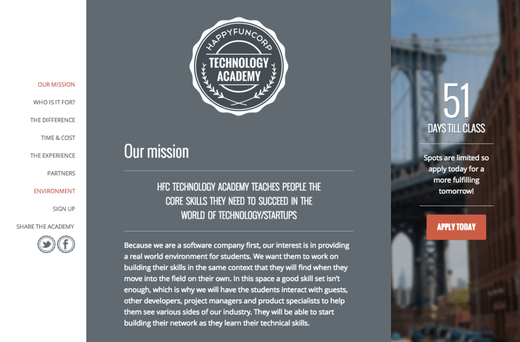 HFC’s client roster includes the likes of American Express, (TechCrunch corporate overlord) AOL, Bloomberg, Citi, LinkedIn, McGrawHill, MoMA, Scribd, Verisign, Victoria’s Secret and The Webby Awards, to name a few. It’s planning to draw on that network to help graduates of its Academy find jobs at the end of their course — and, indeed, is likely to be cherrypicking promising candidates itself.