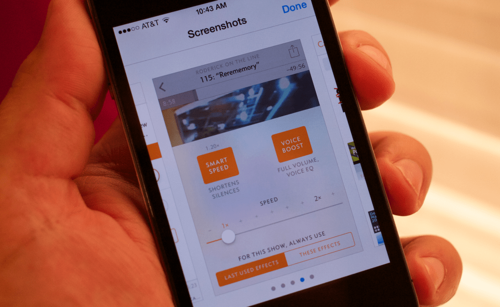 Just as a listener, I hear…when you listen to sped-up podcasts, it’s a waste. You hear all the silences that are longer than they have to be, and then someone has to say their words super fast, and it distorts them, so I said, “Let me try to even this out a little bit.” I wanted to play with that, and play with different time-stretching algorithms also, because at the time I first started doing this in the fall of 2012 — I don’t think Apple shipped any fancy speed algorithms on the iPhone.