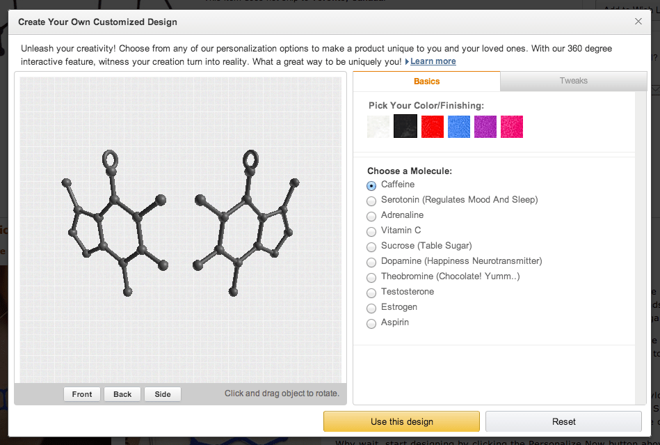 Along with the launch of the store, Amazon is introducing a new personalization tool for customizing some of the 3D-printed designs, which opens up a widget that lets you choose from a number of basic designs, pick the color and finish of your plastic/metal material, and preview what it will look like with a 360-degree 3D preview. You can also tweak individual aspects of the design with some items, including thickness and other dimensions.