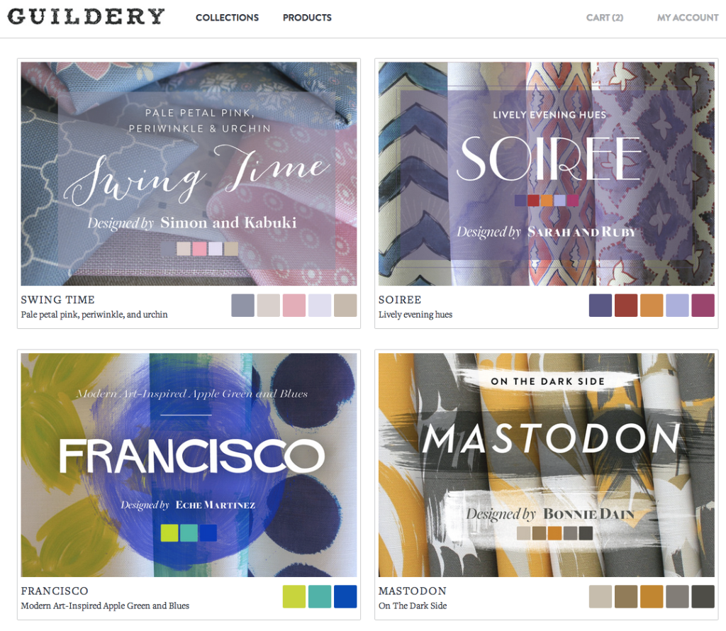 Unless you’re an interior designer, one of the challenges with shopping online for furniture and other upholstered accessories is not knowing whether the colors and patterns you like actually go together. A new company called Guildery aims to solve that problem by offering digitally printed collections of pillows, drapery, lampshades, ottomans and soon, more, which are designed to coordinate with solid shades in order to complete a room.
