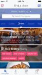 The app finds your location and gives you a sliding header bar with options for breakfast, brunch, lunch, dinner, snacks, nightlife, shopping, etc.